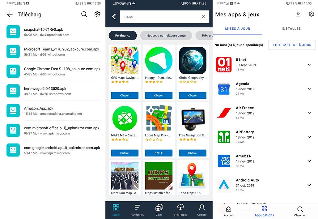 Il nous a donc fallu trouver une alternative à AppGallery. Il existe des stores alternatifs légaux comme l’Amazon Appstore mais ces derniers n’ont que très peu d’applications. Pour récupérer toutes les applications dont nous avions besoin, nous avons dans un premier temps téléchargé des installateurs APK en tapant « nom de l’application + APK » dans un moteur de recherche. Cette méthode fonctionne mais a deux contraintes : vos applications ne seront pas mises à jour et il y a un risque de tomber sur un malware. Nous avons finalement fait le choix d’Aurora Store, un magasin d’applications qui télécharge des applications depuis le Play Store en créant de faux comptes Google. Cette pratique viole les conditions générales de Google et se trouve donc à la limite de la légalité. Cela illustre bien le problème du Mate 30 Pro où tout n’est que galère.