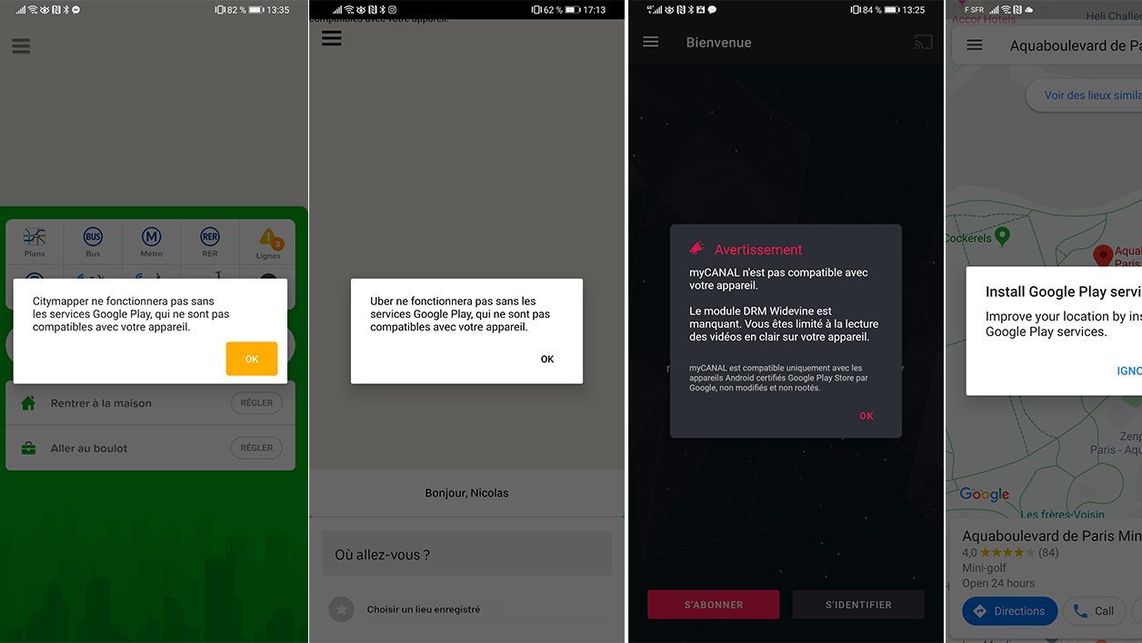 Si la première partie de cet article vous a déjà dégoûté du Mate 30 Pro, la suite risque de vous rebuter encore plus. Sur notre centaine d’applications installées, au moins trente ne fonctionnent pas sur le smartphone. Vous n’avez pas mal lu, près d’un tiers de nos applications du quotidien sont incompatibles avec le dernier mobile de Huawei.