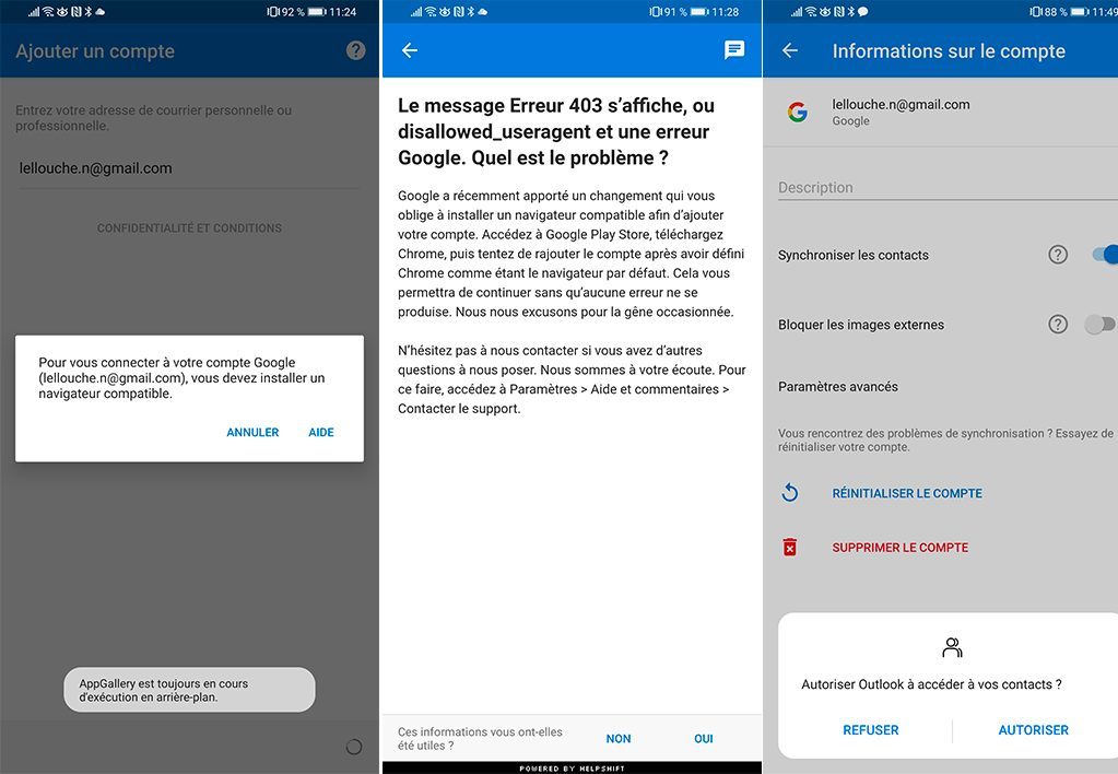 Nous avons trouvé une solution qui, vous allez voir, est assez rustique. Il nous a fallu télécharger Microsoft Outlook (l’application n’étant pas disponible sur le magasin d’applications Huawei, nous avons récupéré un APK sur Internet) et ajouter notre compte Gmail. Cette étape étant impossible sans Google Chrome, nous avons dû télécharger un APK de l’application sur Internet (le navigateur fonctionne mais est amputé de certaines fonctions). De retour dans Outlook, nous avons enfin pu ajouter notre compte Gmail et activer la synchronisation des contacts. Miracle, ça a fonctionné ! Cela reste tout de même assez laborieux pour une fonction aussi basique.