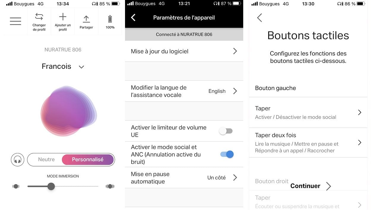 Les Nuratrue disposent de commandes tactiles personnalisables. Hélas, seuls les touchers simples et doubles peuvent être modifiés, ce qui offre au total quatre commandes différentes. Le toucher prolongé est réservé à l’appairage Bluetooth. Néanmoins les commandes se révèlent réactives et des bips de confirmation nous indiquent que le toucher a bien été pris en compte.