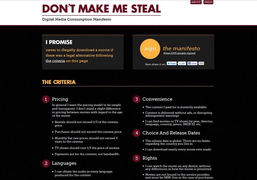 « Nous sommes en 2011 et on attend toujours de nous d’aller au vidéoclub pour louer un film. Nous pourrions certes utiliser iTunes. Mais quel amoureux du cinéma voudrait visionner des films doublés ? Il est si difficile et si frustrant d’obtenir légalement un film. Et c’est pourquoi les gens sont souvent tentés de faire ce qui est le plus facile. Torrent, Open Subtitles et boum, 30 minutes plus tard, c’est comme au cinéma », ajoutent ceux qui appellent les amoureux du septième art à les rejoindre en adhérant à cette déclaration. Les signataires s’engagent à ne plus pirater si l’alternative légale répond à certains critères de tarifs, de langues et de non-utilisation des DRM.