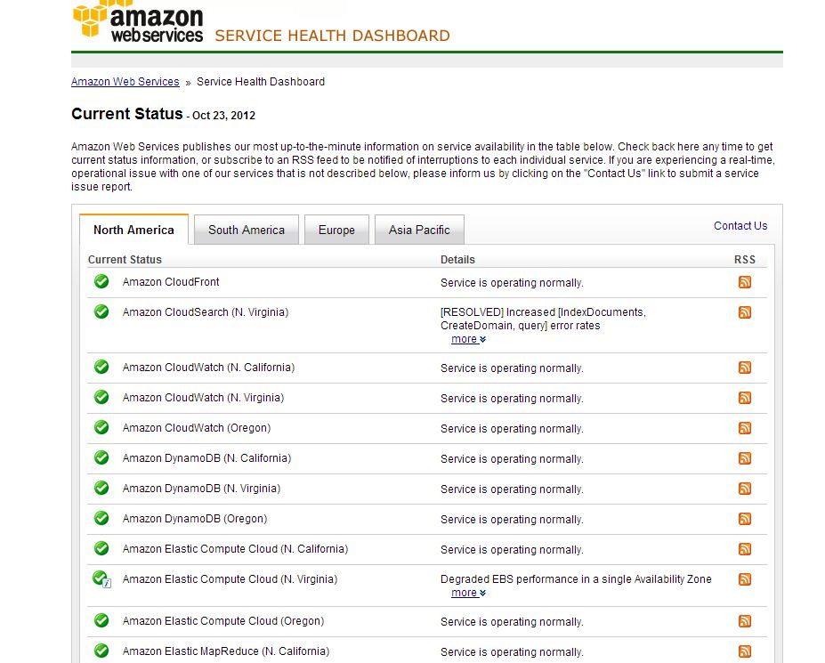 Aujourd’hui, mardi 23 octobre, ce site connaissait encore quelques problème techniques, affectant le service ECS de fourniture de puissance de calcul hébergée chez Amazon et RDS, service d’hébergement de bases de données relationnelles dans le nuage, ainsi que le montre le tableau de bord d’Amazon, affichant l’état de fonctionnement en temps réel de ses différents services cloud par zone géographique et par data center.