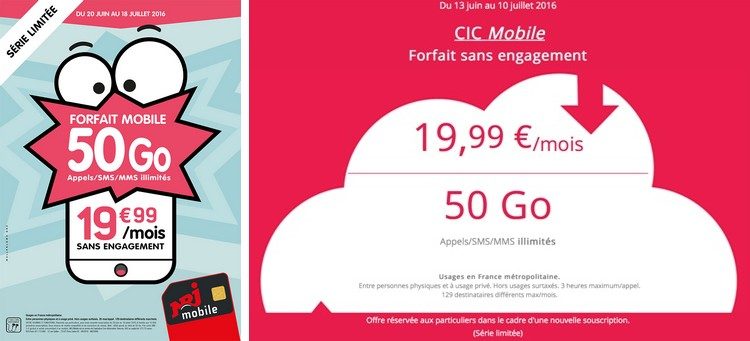Elle est clairement lancée pour concurrencer le forfait illimité de Free Mobile mais n’y arrive que partiellement. En effet, elle ne peut être souscrite que jusqu’au 10 juillet pour les marques Crédit Mutuel Mobile et CIC Mobile (forfait Prompto 50 Go) ainsi que du 20 juin au 18 juillet pour NRJ Mobile (forfait Woot 50 Go).