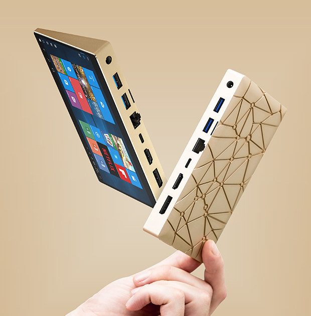Mais sa compacité n’est pas tout. Il a été pensé autant pour être un petit PC transportable, qui peut être branché à un écran, un clavier et une souris, que comme appareil mobile, utilisable seul grâce à son écran tactile. Il embarque en effet une batterie 3000 mAh, qui est donnée pour lui assurer jusqu’à 4 d’autonomie en lecture vidéo.