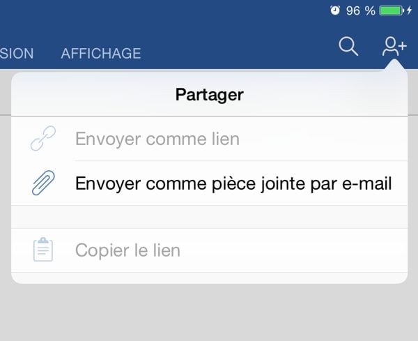 Enfin, à l’extrême droite, deux icônes. La loupe lance évidemment la fonction de recherche (Rechercher et remplacer, avec les sous-fonctions Respecter la casse, Mots entiers). Enfin, dernière icône, qui donne accès aux fonctions de partage, qui se fait par pièce jointe dans un mail ou par le partage d’un lien via One Drive.