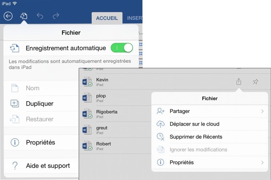 Si vous appuyez sur le deuxième bouton en partant de la gauche, vous pourrez alors choisir le nom du fichier ou éventuellement le dupliquer, il sera par défaut enregistré sur l’iPad. C’est dans ce menu que vous trouverez aussi les propriétés du fichier. A noter que par défaut, l’enregistrement est automatique une fois le fichier nommé.