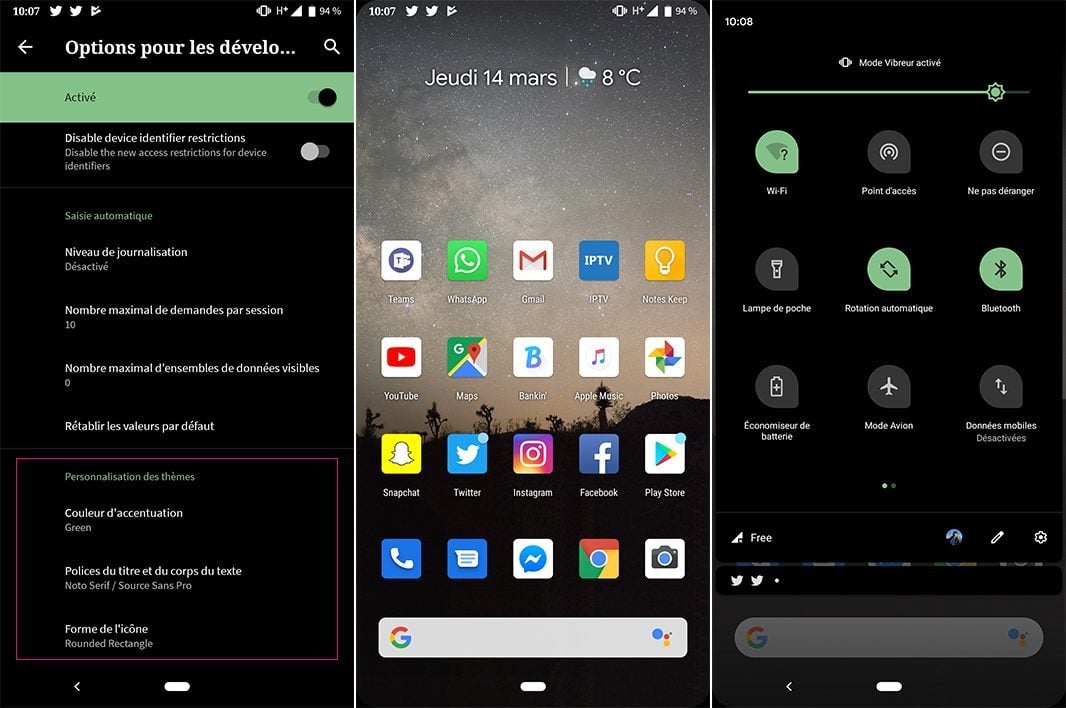 Dans les options développeur (à activer en appuyant 7 fois sur le numéro de build dans les réglages), on trouve tout en bas le sous-menu Personnalisation des thèmes. On peut choisir une police système différente, changer la forme des icônes et sélectionner une nouvelle couleur d’accentuation. Les possibilités sont encore très restreintes dans cette bêta 1, mais c’est très prometteur.