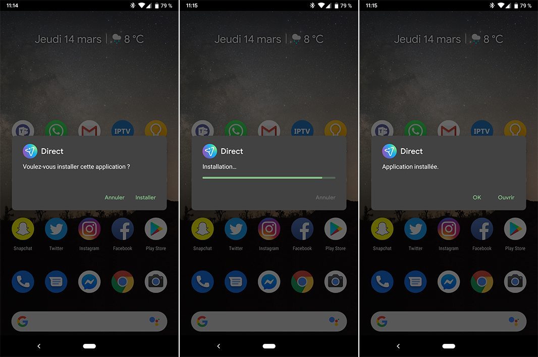 Avantage d’Android sur iOS (ou inconvénient, cela dépend des points de vue), la possibilité d’installer des applications depuis n’importe quelle source. Jusque-là, ouvrir un fichier APK lançait un installateur en plein-écran. Avec Android Q, il n’y aura plus qu’une petite barre de chargement au milieu de l’écran. Là encore, Google simplifie Android.
