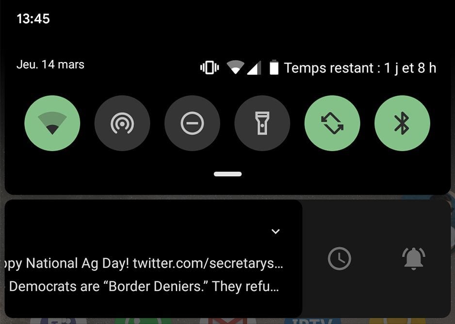 Enfin, de manière plus anecdotique, on remarque quelques nouveautés dans Android Q. Dans le centre de notifications, la police utilisée par l’heure est différente. D’ailleurs, au lieu d’afficher le pourcentage de batterie restante, on a désormais une estimation du temps restant avant extinction de l’appareil.