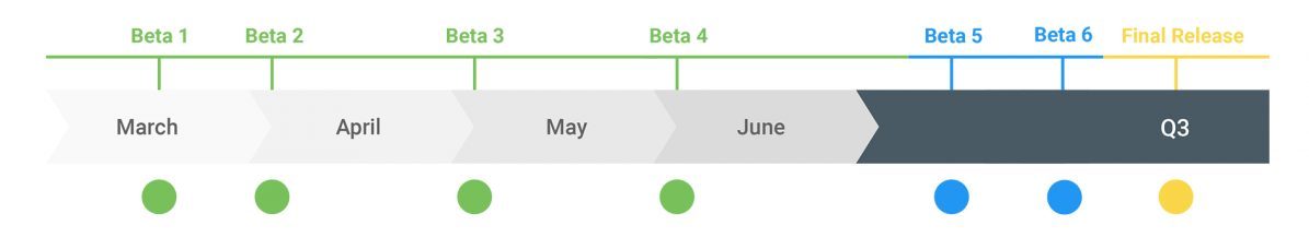 Sur le site développeur de Google, la bêta 1 est d’ores-et-déjà disponible pour les propriétaires de smartphones Pixel. Une bêta 2 est déjà annoncée pour début d’avril, ainsi qu’une bêta 3 plus complète après l’I/O. Google a publié son planning officiel de sorties.