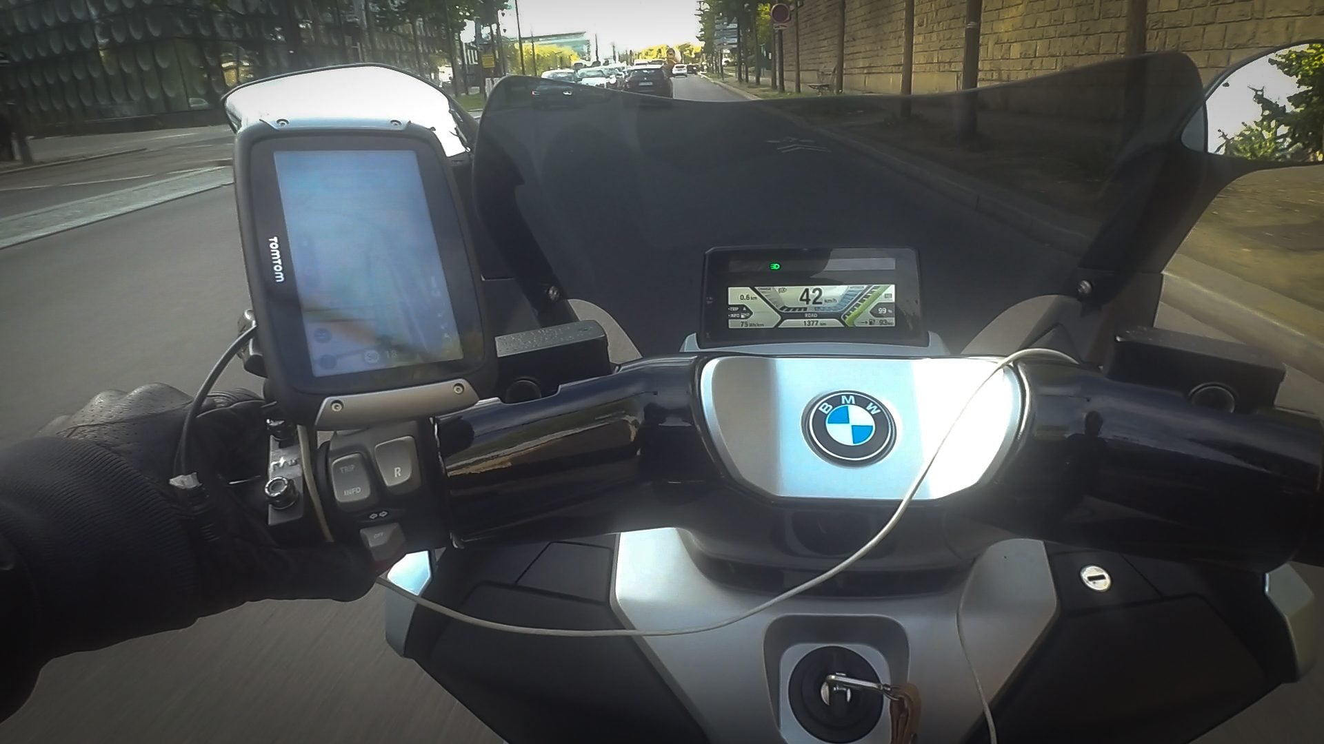 Dans notre cas, nous avons fixé notre TomTom Rider 450 de manière un peu artisanale sur la poignée de gauche. Mais on le reconnaît, même si les commandes restaient accessibles (clignotant et klaxon en l’occurrence), ce n’est tout de même pas génial. S’agissant d’un scooter de test, il ne nous était pas possible de faire les aménagements nécessaires pour fixer plus proprement le GPS.