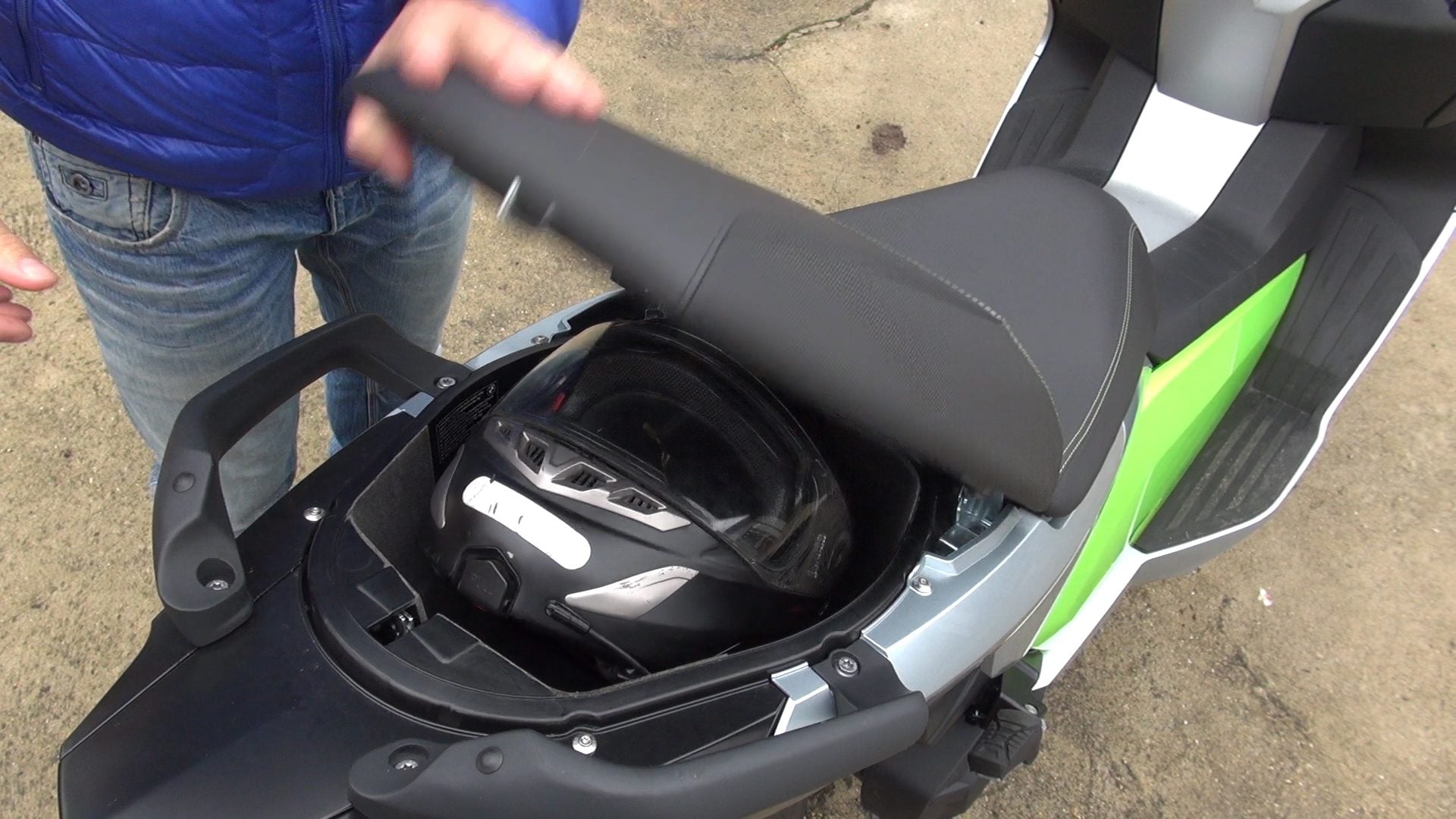 A commencer par la taille du coffre, trop petit pour permettre d’y ranger notre casque intégral. D’autres modèles, plus petits ou d’une forme pourront y être rangés et, à coup sûr un demi-jet y trouvera sa place. D’ailleurs, si le casque n’est pas trop gros, il sera même possible de ranger aussi le câble de charge dans le coffre. Sinon, en s’y prenant bien, il est possible de loger ce dernier dans un compartiment situé à droite, sous le guidon. Pour plus de place, il est possible d’investir dans un « top case » que BMW propose à 525 euros environ.