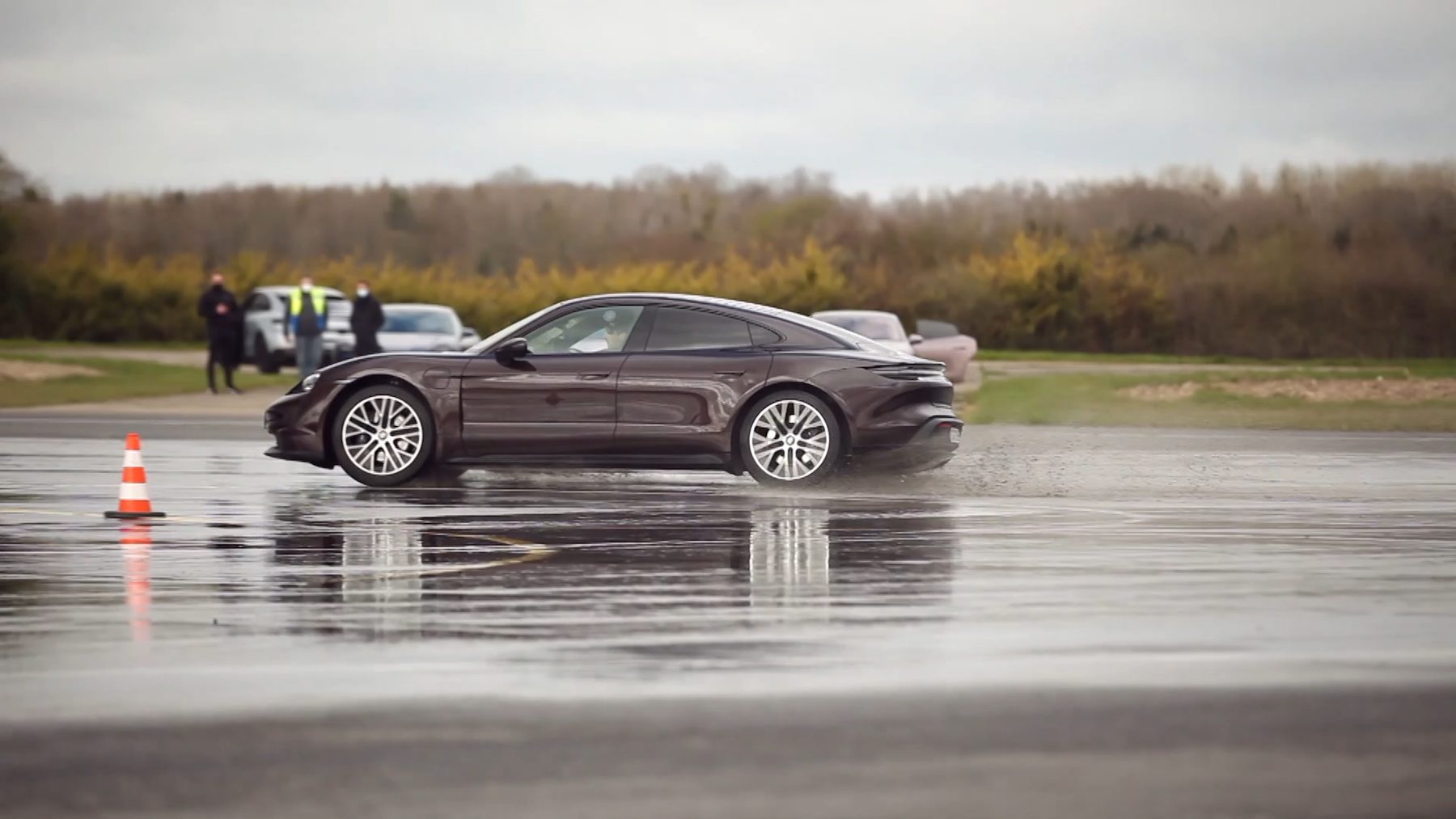 Nous avons eu la chance de tester cette Taycan sur le circuit de Bosch, dans les environs de Reims, et plus particulièrement sur trois ateliers drift. Le premier enseignement à tirer de cet exercice, c’est l’excellent comportement des assistances électroniques de la voiture. En effet, lorsque le PSM est activé, c’est-à-dire lorsque l’ABS et l’anti patinage sont gérés par l’informatique du véhicule, il est très difficile de la prendre en défaut et de la faire valser.