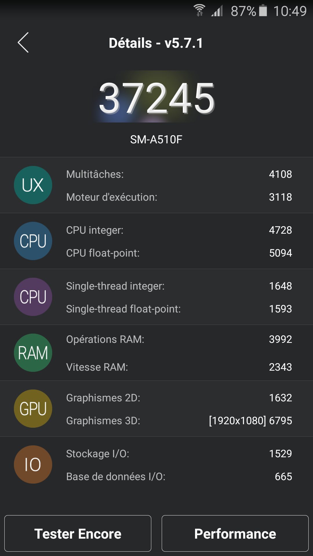 Nos premiers tests ont permis d’obtenir des scores de 37 245 sous AnTuTu 5, 40 899 sous AnTuTu 6 et 28.6 images par seconde sous Epic Citadel, ce qui, sur ce dernier score, s’avère un peu juste pour les jeux 3D les plus sophistiqués. Attention toutefois, le modèle que nous avons pris en main n’était pas la version définitive qui sera commercialisé en magasin. Les résultats pourraient donc varier légèrement sur cette dernière. A titre de comparaison, le précédent Galaxy A5 obtenait un score bien moins important de 20 011 sous AnTuTu 5.