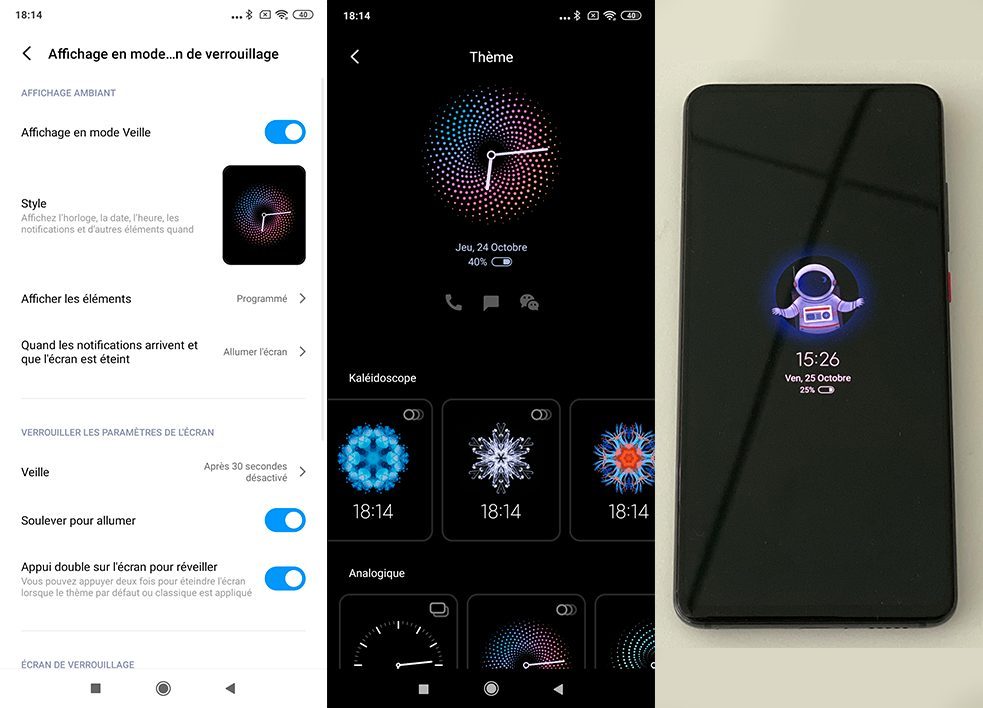 Avec MIUI 11, l’écran toujours allumé gagne en possibilités de personnalisation. Des dizaines d’options amusantes sont désormais proposées et permettent, par exemple, d’afficher un kaléidoscope ou un spationaute au-dessus de l’heure. Il est aussi possible d’écrire un texte, de choisir sa couleur et de laisser ces éléments affichés sur son écran en permanence. Là-encore, on ne parlera pas de révolution mais c’est assez cool.