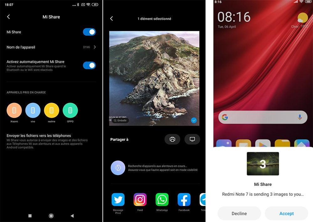 Avec MIUI 11, Xiaomi lance enfin ce fameux système. Baptisé « Mi Share », il permet de transférer en une dizaine de secondes autant de fichiers que l’on souhaite vers un autre smartphone. Son fonctionnement est extrêmement simple : sélectionnez par exemple 10 photos, touchez le bouton partager et les correspondants disponibles apparaîtront au-dessus des autres options, comme sur un iPhone.