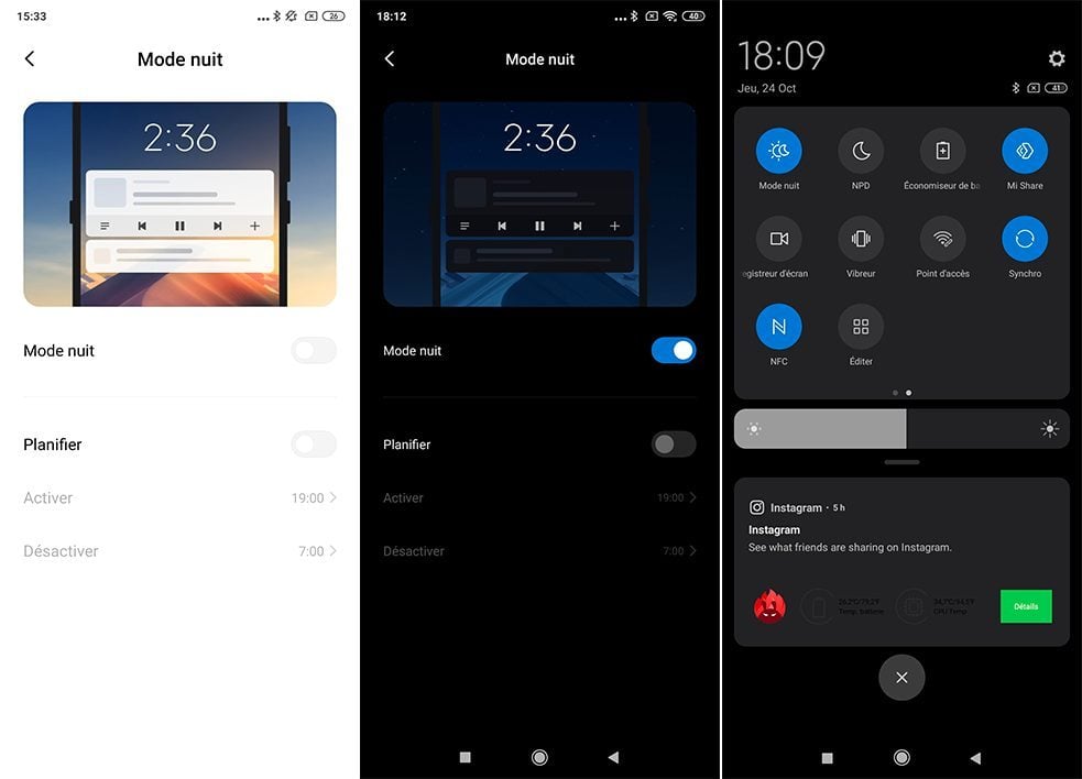 Android 10 oblige, le mode nuit est également à l’honneur. Déjà présent dans les précédentes versions de MIUI, il utilise désormais le réglage natif de Google et propose un onglet de programmation pour, par exemple, s’activer automatiquement lorsque le soleil est couché.