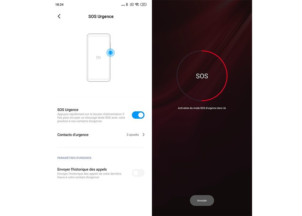 Calquée sur la fonction urgence d’iOS, « Emergency SOS » vous permet de désigner des personnes à contacter en cas d’urgence. Si vous appuyez cinq fois sur le bouton de déverrouillage, vos contacts choisis recevront un SMS avec votre localisation ainsi que votre journal d’appels sur la dernière heure. Le problème est que quand nous avons testé le service, aucun SMS n’a été envoyé aux contacts que nous avions enregistrés. Espérons que cette fonction se montrera plus fiable dans les prochains mois puisque, pour l’instant, MIUI 11 laisse mourir son utilisateur.