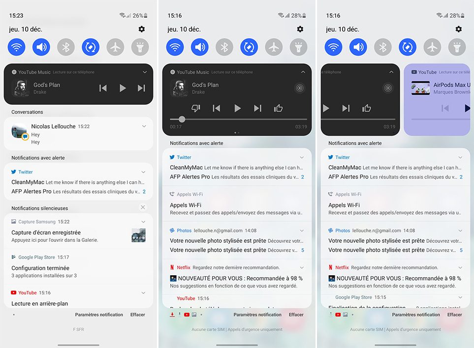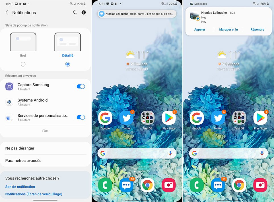 Puisque l’on vous parle de notifications, saluons aussi la bonne idée de Samsung qui propose désormais de choisir dans les réglages entre un affichage simplifié des alertes (celui choisi par défaut) et un affichage développé. Souvent, One UI n’affichait pas assez d’informations, ce qui nous contraignait à ouvrir le message. Désormais, on peut tout voir d’un coup. C’est moins minimaliste, mais beaucoup plus pratique.