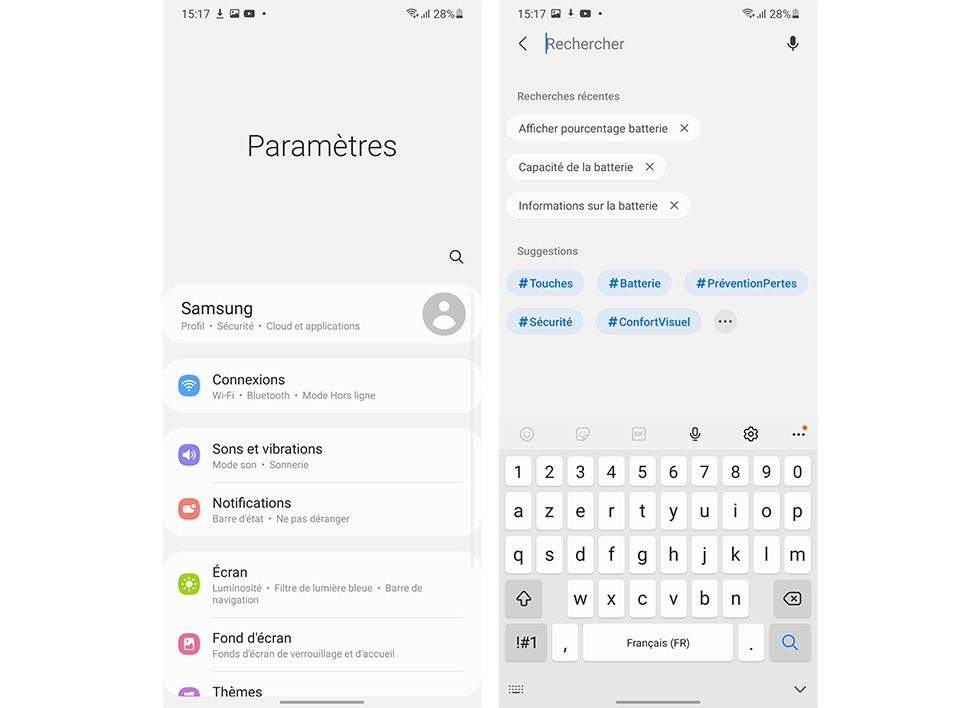 Pendant longtemps, les réglages des smartphones Samsung étaient, selon nous, les plus compliqués à appréhender. Avec One UI, le Coréen a simplifié l’expérience utilisateur et propose désormais une interface plus correcte. Sans révolution, la version 3.0 de la surcouche améliore le tout en simplifiant les sous-menus et, surtout, en boostant son champ recherche. Plusieurs propositions sont indiquées et, en cas de faute d’orthographe, l’intelligence artificielle de Samsung essaye tout de même de trouver ce que vous recherchez.