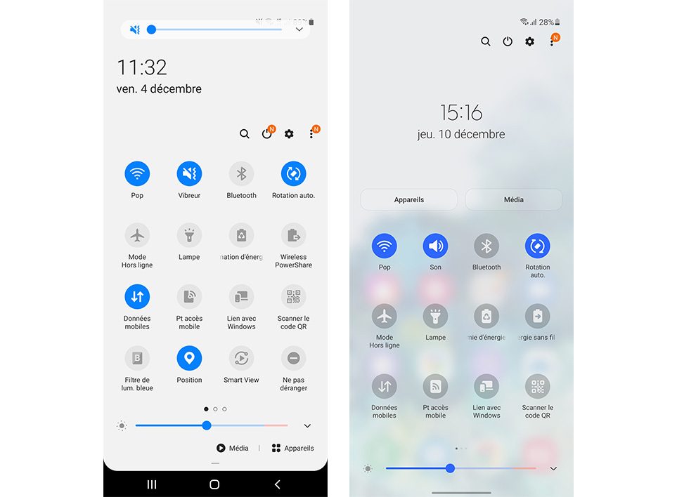 Toujours dans le centre de notifications, le volet de raccourcis a aussi droit à un nouveau design. Plus pratique à utiliser, ce dernier rapproche les boutons du bas de l’écran afin de les rendre plus accessibles. C’est une bonne idée, dans l’ADN de One UI.