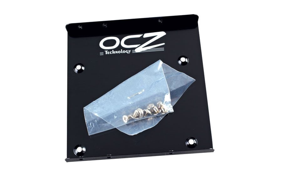 Si vous désirez utiliser un disque SSD dans votre PC de bureau, vous ne pouvez pas le fixer directement, car les logements utilisent en général le format 3,5 pouces. OCZ Technology livre un berceau en métal avec deux jeux de quatre vis pour fixer le disque sur le berceau, avant de fixer le tout dans le logement 3,5 pouces de l’ordi.