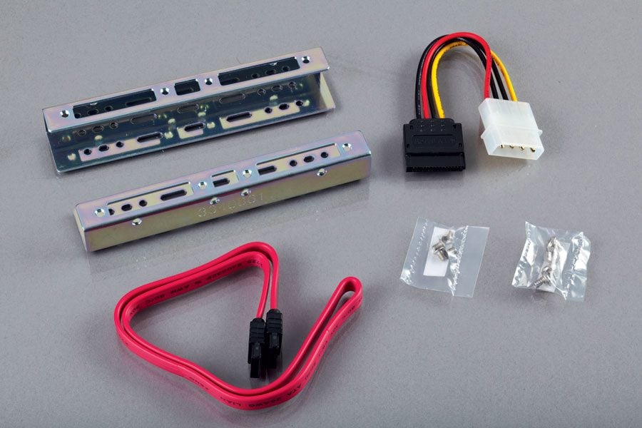 Si vous voulez installer le disque SSD dans votre PC portable, il vous suffit d’ouvrir ce dernier pour brancher le disque. Dans un PC de bureau, vous aurez besoin d’installer le disque dans un emplacement au format 3,5 pouces. Kingston livre le nécessaire pour cela : deux rails servant à augmenter la largeur du disque, les vis, le câble S-ATA et celui d’alimentation.