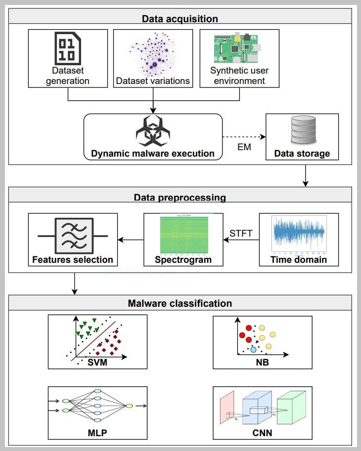 Les chercheurs ont alors eu l’idée de se doter d’une collection d’une trentaine de malwares, de les exécuter sur un objet connecté et, pour chacun d’eux, d’enregistrer trois mille fois de suite la fuite électromagnétique résultante. L’objet en question était un Raspberry 2B préchargé, pour l’occasion, d’une arborescence de fichiers réaliste. À titre de comparaison, les chercheurs ont également enregistré plus de 10 000 fuites électromagnétiques générées par des exécutables bénins.
