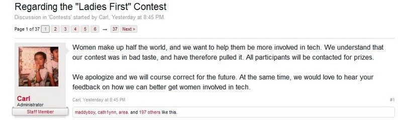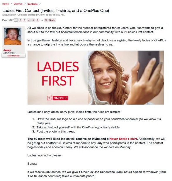 C’est sur son forum que la marque de smartphones avait lancé ce concours intitulé Ladies First. Désireux de compter plus de femmes parmi sa clientèle, OnePlus proposait à ces dernières de se prendre en photo avec le logo de la marque pour gagner un tee-shirt et une invitation pour acheter son dernier appareil, le One.