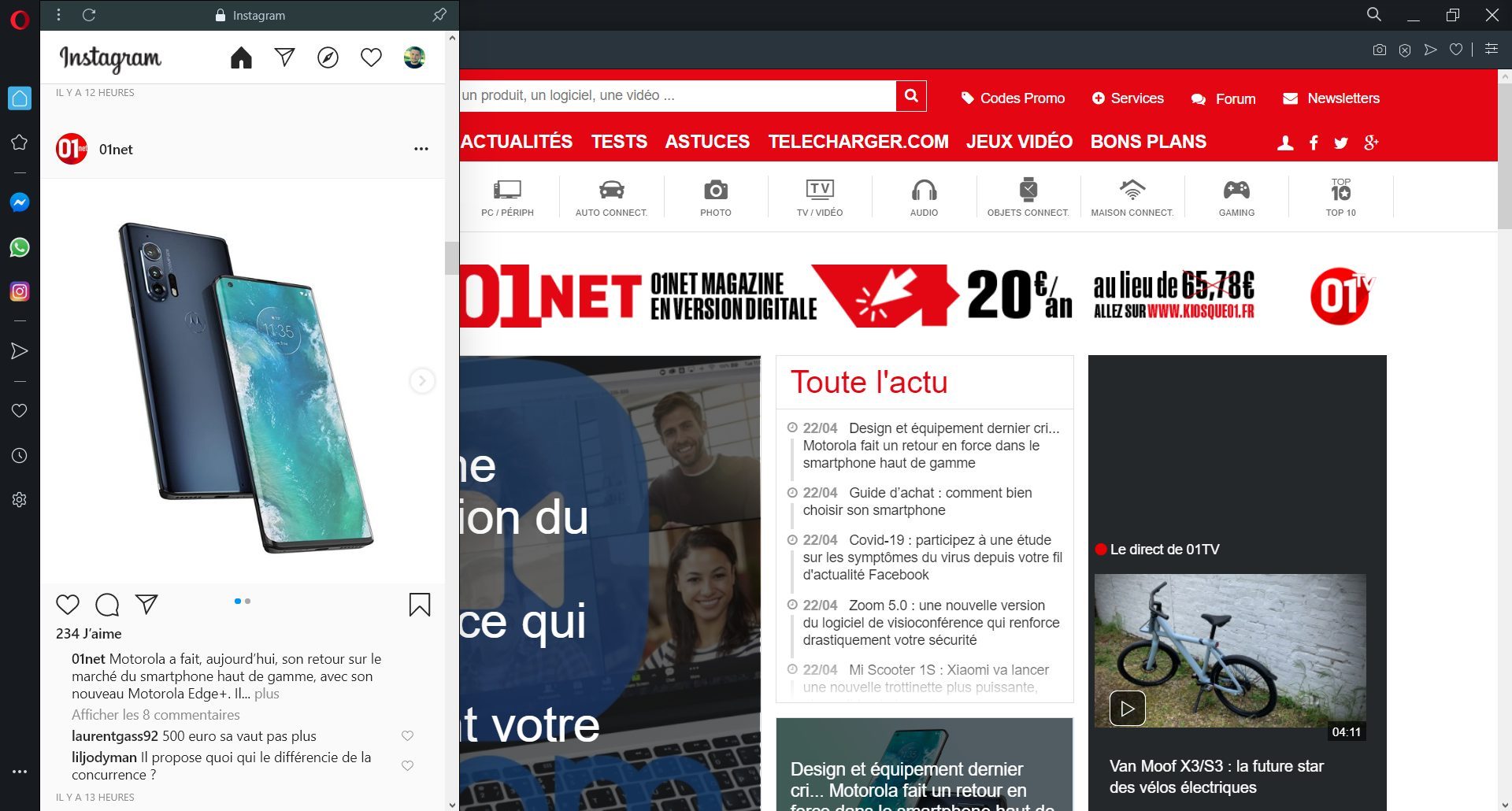 Opera 68 profite directement de cette disponibilité sur le web pour offrir un accès direct dans une fenêtre flottante redimensionnable. L’accès et l’activation de la fonction ne requièrent aucune manipulation particulière si ce n’est de se connecter à son compte Instagram après avoir cliqué sur le bouton idoine.
