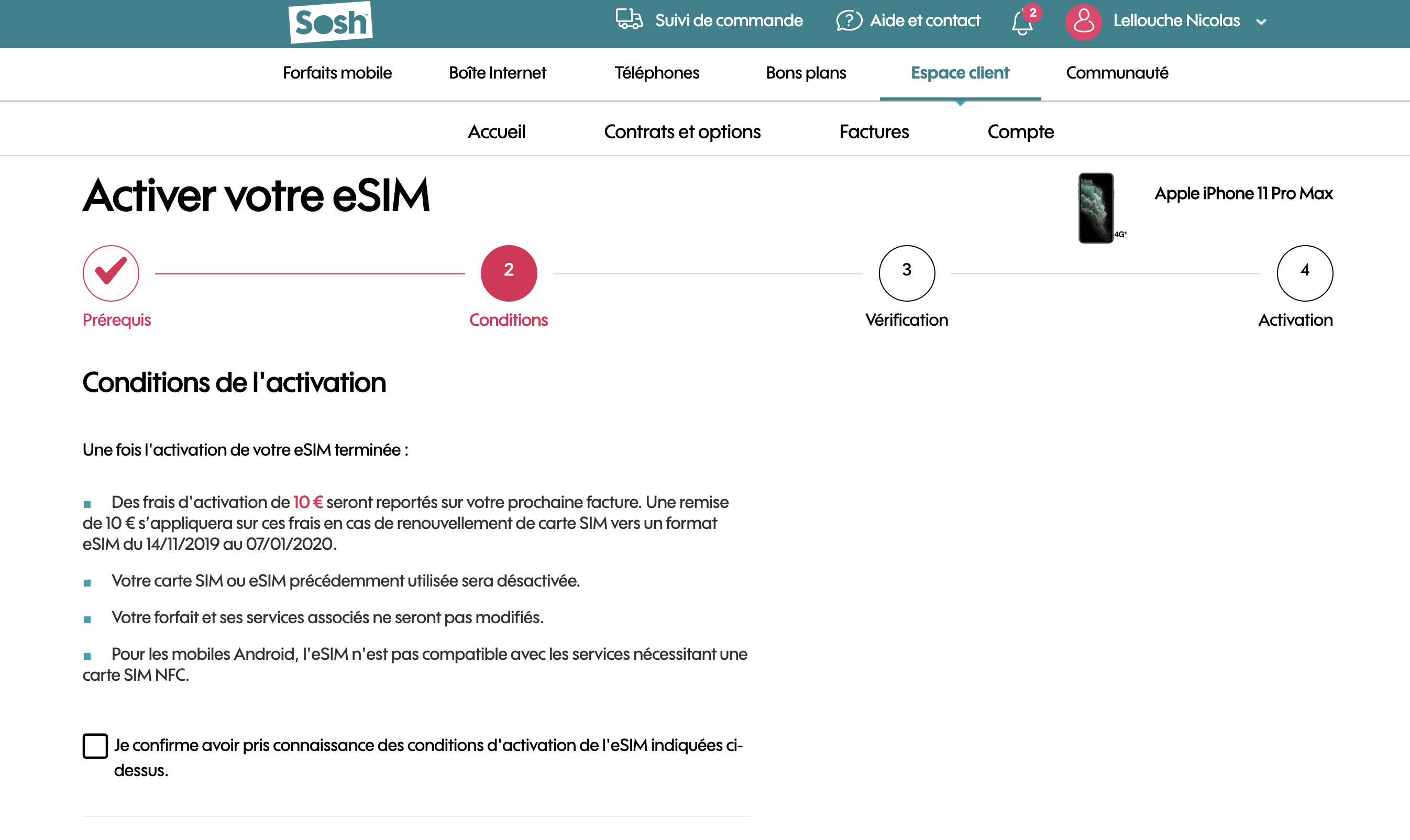 Nous avons essayé de passer d’une nano SIM Sosh à une eSIM sur un iPhone compatible et nous avons en effet eu accès à une promotion valable «du 14/11/2019 au 07/01/2020». Cette dernière permet de bénéficier d’une «remise de 10 € en cas de renouvellement de carte SIM vers un format eSIM». C’est l’occasion parfaite pour passer à l’eSIM gratuitement.