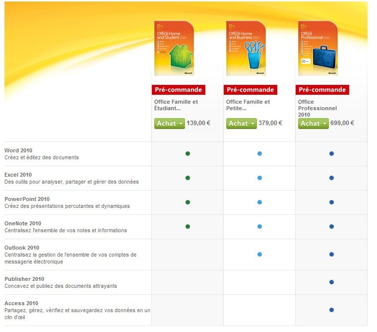 Les pré-commandes concernent le téléchargement et les versions boîtes. On y découvre les trois versions commercialisées dans l’Hexagone : Office Famille et Etudiant (Word, Excel, Powerpoint, OneNote) au prix de 139 euros, Office Famille et Petite entreprise (idem que la précédente + Outlook) au prix de 379 euros, Office Professionnel (idem que les précédentes + Publisher et Access) au prix de 699 euros.