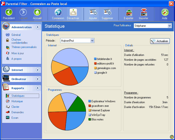 Parental Filter établit, pour chaque utilisateur, un rapport complet indiquant les logiciels utilisés, les sites visités, les messages envoyés et reçus…