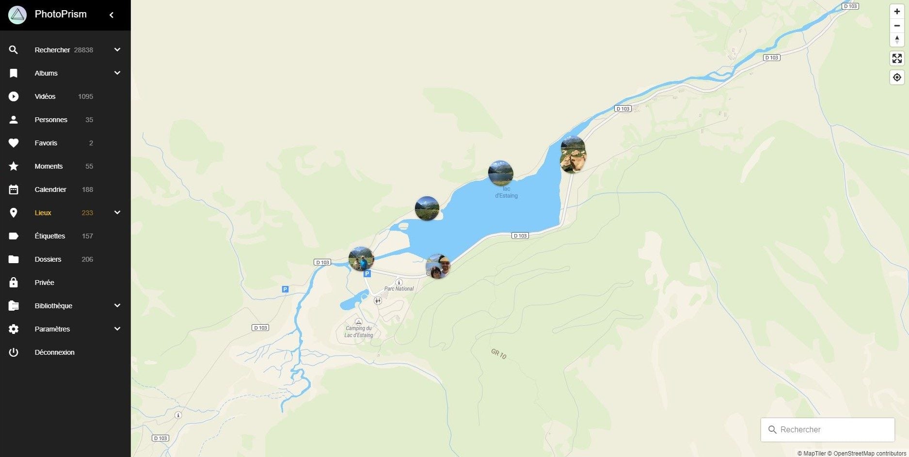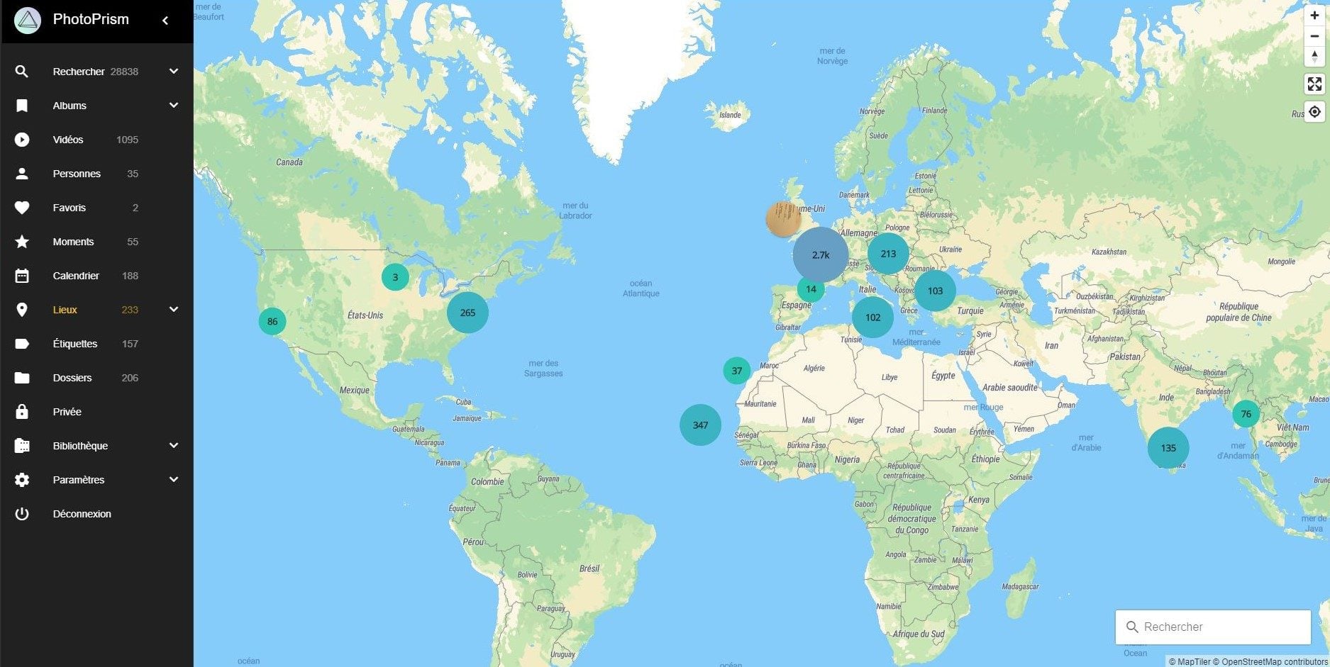 L’utilisateur peut également s’orienter vers les différents menus d’accès du panneau latéral. Si l’on clique sur « Lieux », on obtient une carte du monde dans laquelle on peut zoomer pour atteindre les photos qui disposent de données de géolocalisation. Ce qui est très sympa à faire.