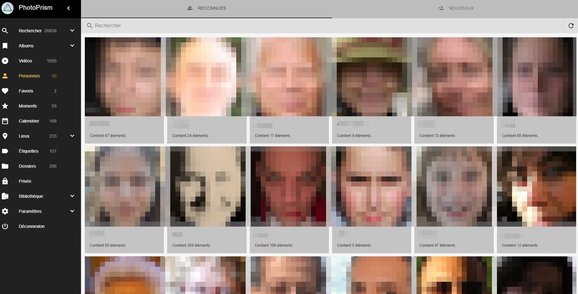 Au travers du menu « Personnes », on obtient un classement par reconnaissance faciale de très bonne facture. L’algorithme de PhotoPrism crée automatiquement des clusters de personnes que l’on pourra regrouper sous un même nom s’il s’agit du même individu. L’utilisateur a donc ici un peu de travail, mais rien de très gênant. Le regroupement de clusters est une affaire de quelques minutes.