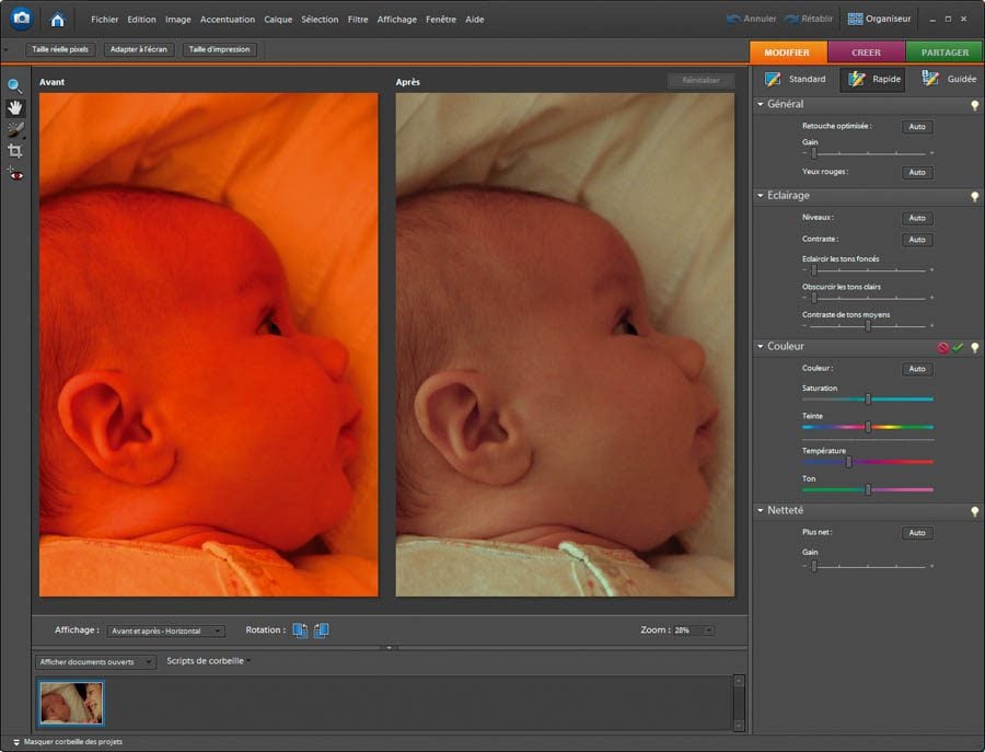 modifications effectuées sur les clichés. Vous ne pouvez plus perdre un original par mégarde ! A noter que les retouches automatiques manquent encore de finesse.Il faut donc souvent se lancer dans une retouche manuelle, mais ce n’est pas grave tant le logiciel est agréable à utiliser. On retrouve l’efficacité de Photoshop (le vrai) avec ces outils précis et sa collection de filtres. On