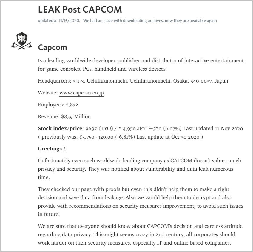 L’éditeur de jeux vidéo japonais Capcom vient de révéler que ses systèmes ont été victime du ransomware Ragnar Locker. L’infection s’est produite le 2 novembre dernier. À cette occasion, de nombreux documents ont malheureusement été volés, à commencer par les données personnelles d’environ 364 000 clients, partenaires, employés et candidats à l’embauche.
