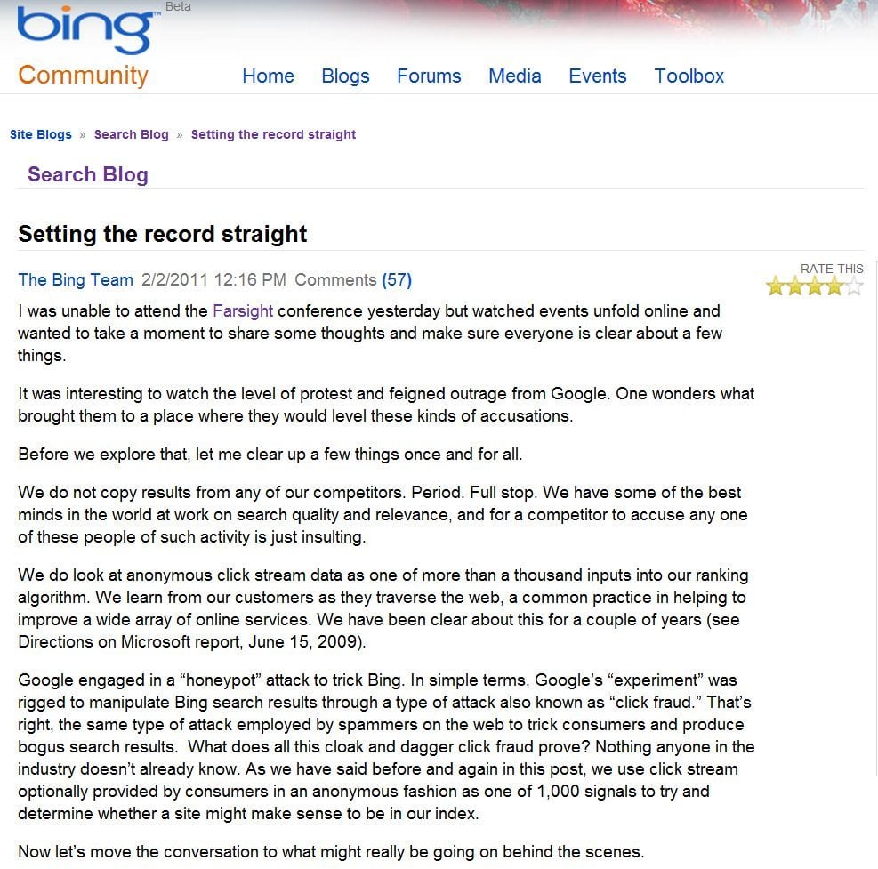A la fin du message, Y. Mehdi annonce enfin que si Google a réagi de cette façon, c’est sans doute parce que le géant de la recherche sur Internet est inquiet devant les avancées de Bing : « Nous avons fait des progrès incessants et discrets sur la pertinence des recherches. Des progrès si importants qu’on nous a dit que Google les avait remarqués et avait commencé à s’en inquiéter. Et, quelque temps plus tard, voilà que les attaques “pot de miel” ont commencé. Ce timing est est-il juste une coïncidence ? »