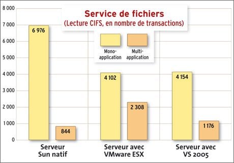 simultanément. Particulièrement stressant au niveau des entrées/sorties, ce test de service de fichiers met en évidence l’impact de la virtualisation sur ces dernières. Dans le meilleur des cas (en monotâche), le nombre de transactions subit une