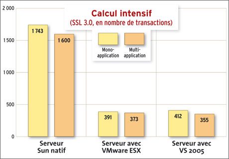 directement le niveau de performance SSL relevé. Mieux encore, le passage en multitâche, alors qu’il fait chuter de près de 10 % la performance SSL du serveur seul, ne réduit que de 5 % celles des environnements virtualisés. Les solutions