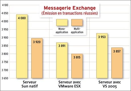 Premier constat : que le serveur soit virtualisé avec un seul CPU ou non, il offre à peu près le même niveau de performance en nombre de transactions maximal. Est-ce à dire qu’Exchange 2003 ne tire pas parti du mode SMP ?