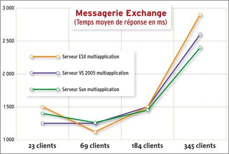 cadre d’un profil de charge multiapplication, force est de constater que l’impact de la couche de virtualisation est négligeable, voire positif à moyenne charge ! En effet, à 69 clients, Exchange avec ESX affiche un temps de réponse