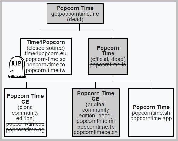 Plusieurs forks ont alors vu le jour, dont « Time4Popcorn.eu », qui est devenu au final « Popcorn-time.tw ». Cette variante a été déclinée sur toutes les plates-formes : Windows, Mac, Android, Android TV, iOS, Linux. Selon TorrentFreak, elle aurait eu, durant ses heures de gloire, des millions d’utilisateurs dans le monde.