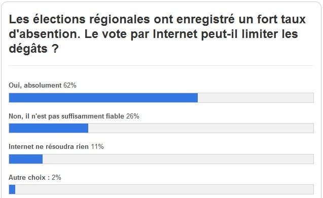 La réponse est oui, selon les résultats des 3 000 votes enregistrés. Vous êtes 62 % à considérer que le vote par Internet limiterait les dégâts en matière d’abstention. 26 % des votants considèrent que le vote en ligne (à ne pas confondre avec le vote électronique, sur des machines) n’est pas suffisamment fiable, et 11 % qu’il ne résoudra rien en matière d’abstention. Pouvoir voter depuis le PC de son bureau ou de sa chambre n’est pas une solution, selon ces derniers.