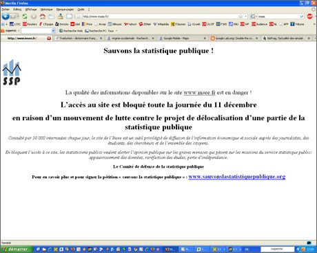 la fin pour le public d’un accès gratuit et facile aux informations statistiques, comme c’est le cas actuellement.En cette matinée du 11 décembre, Insee.fr s’est donc réduit à une page unique affichant le communiqué de protestation d’un collectif d’agents et de syndicats, intitulé ‘ Sauvons la statistique publique ‘.