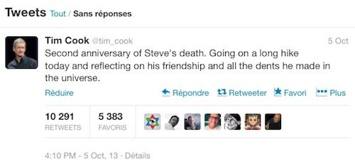 Cette année, pas de vidéo. Pour le second anniversaire du décès de Jobs, Cook a publié un tweet pour le public et une lettre aux salariés d’Apple. Dans son micro message, le CEO propose aux fans de réfléchir au message que le « patron » a laissé au monde. Pour sa part, il ira faire « une longue randonnée » pour méditer.