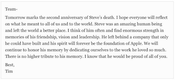 Dans le courrier aux salariés, il laisse le même message en un plus de mots. Il rappelle que Steve Jobs reste à ses yeux un « homme extraordinaire » qui a fait un « monde meilleur ». Il confie également qu’il pense souvent à lui et qu’il trouve « une force énorme dans les souvenirs de son amitié, de sa vision et de sa capacité à diriger. »
