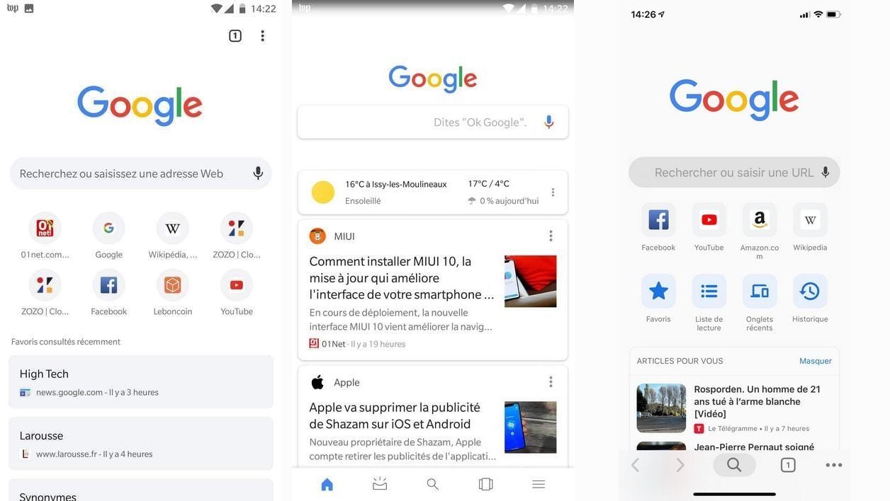 A gauche, les versions Android de Chrome et de l’application Google. A droite la version iOS de Chrome. Toutes affichent déjà le Feed qui va devenir Discover sur Google.com.