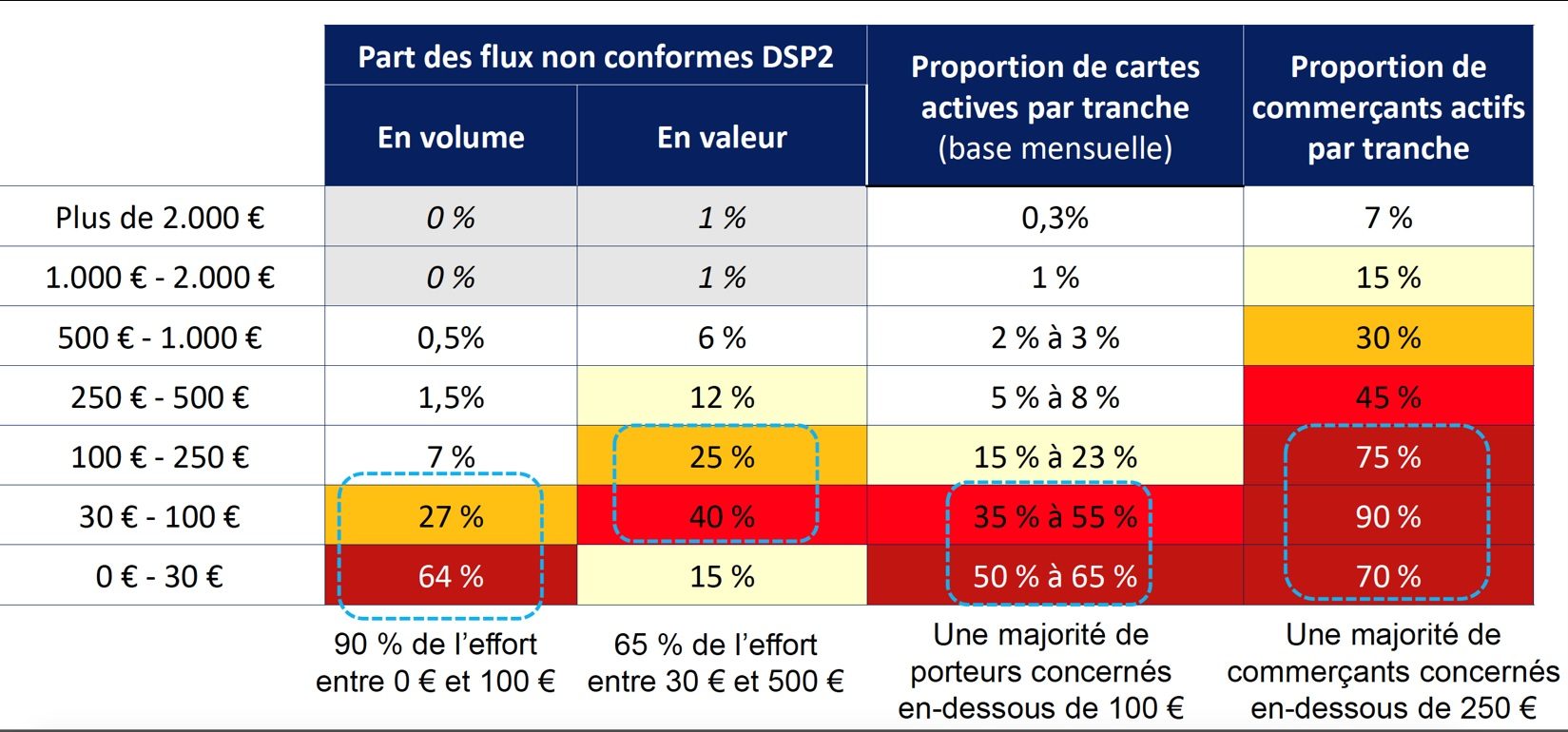 Ce changement de seuil fait suite à ceux du 1er octobre 2020 (plus de 2000 euros), du 15 janvier 2021 (plus de 1000 euros), du 15 février (plus de 500 euros) et du 15 mars (plus de 250 euros). Les commerçants ont 4 semaines pour mettre en place cette nouvelle mesure sur leurs sites. Selon les chiffres de la Fevad (Fédération du e-commerce et de la vente à distance) ci-dessous, la tranche 100-250 euros concerne 75% d’entre eux, avec 25% des flux qui ne sont pas encore conformes.