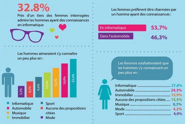 Si les nouvelles technologies ont envahi notre quotidien, nous ne savons pas toujours comment changer un disque dur, reconfigurer un PC… En particulier parmi la gent féminine, ce qui ouvre un nouveau terrain de séduction pour les hommes ! D’après les résultats d’une enquête menée pour le site Crucial.fr publiés le 22 mai 2013, les femmes sont plus attirées par les hommes qui s’y connaissent en informatique (53,7 %) que par ceux qui bricolent leur voiture (46,3 %). Mieux, un tiers des femmes se disent admiratives pour ces experts des nouvelles technologies.